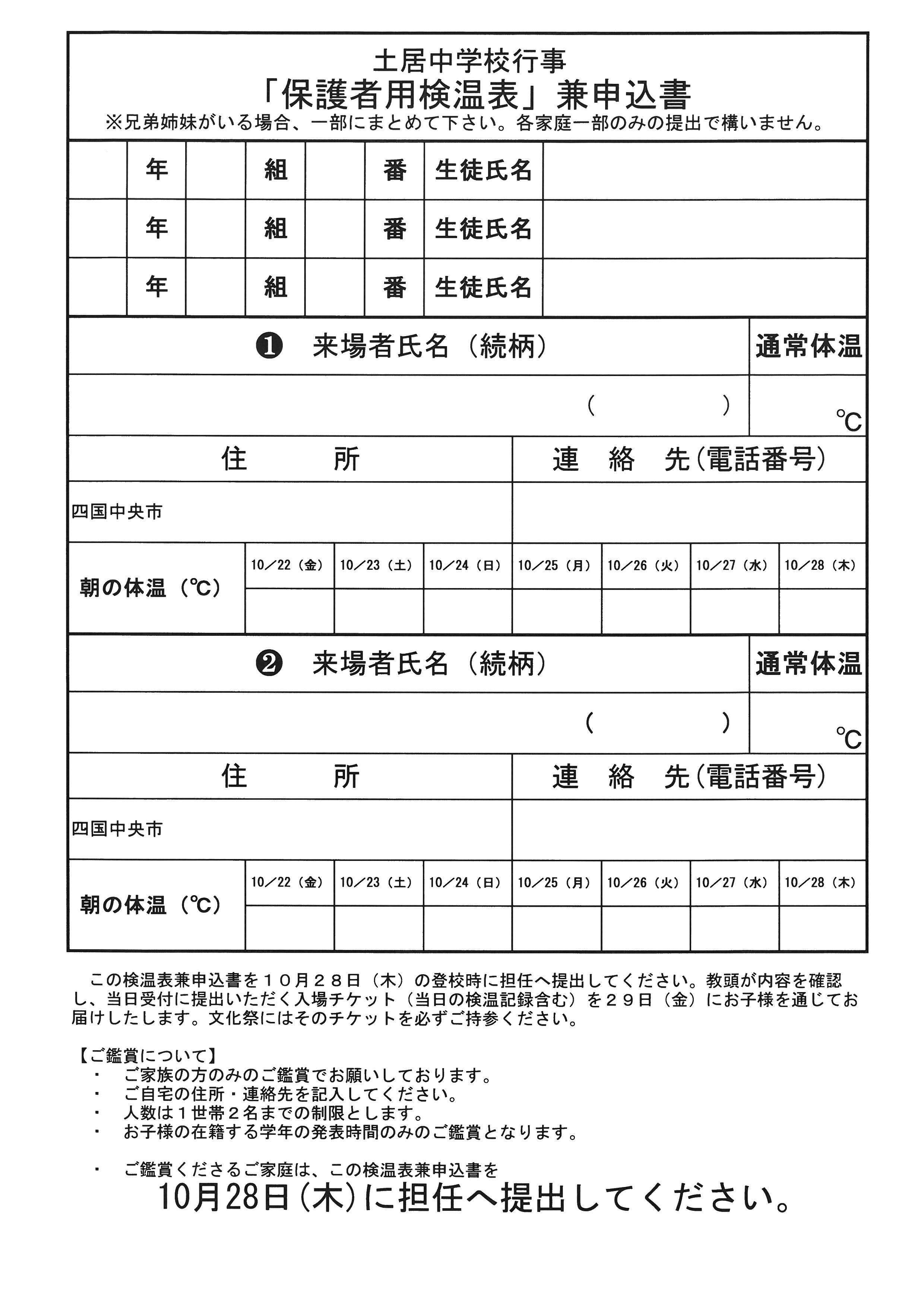 土居中学校文化祭の開催について(ご案内)、「保護者用検温表兼」申込書 の2種類のプリントを配布いたしました。