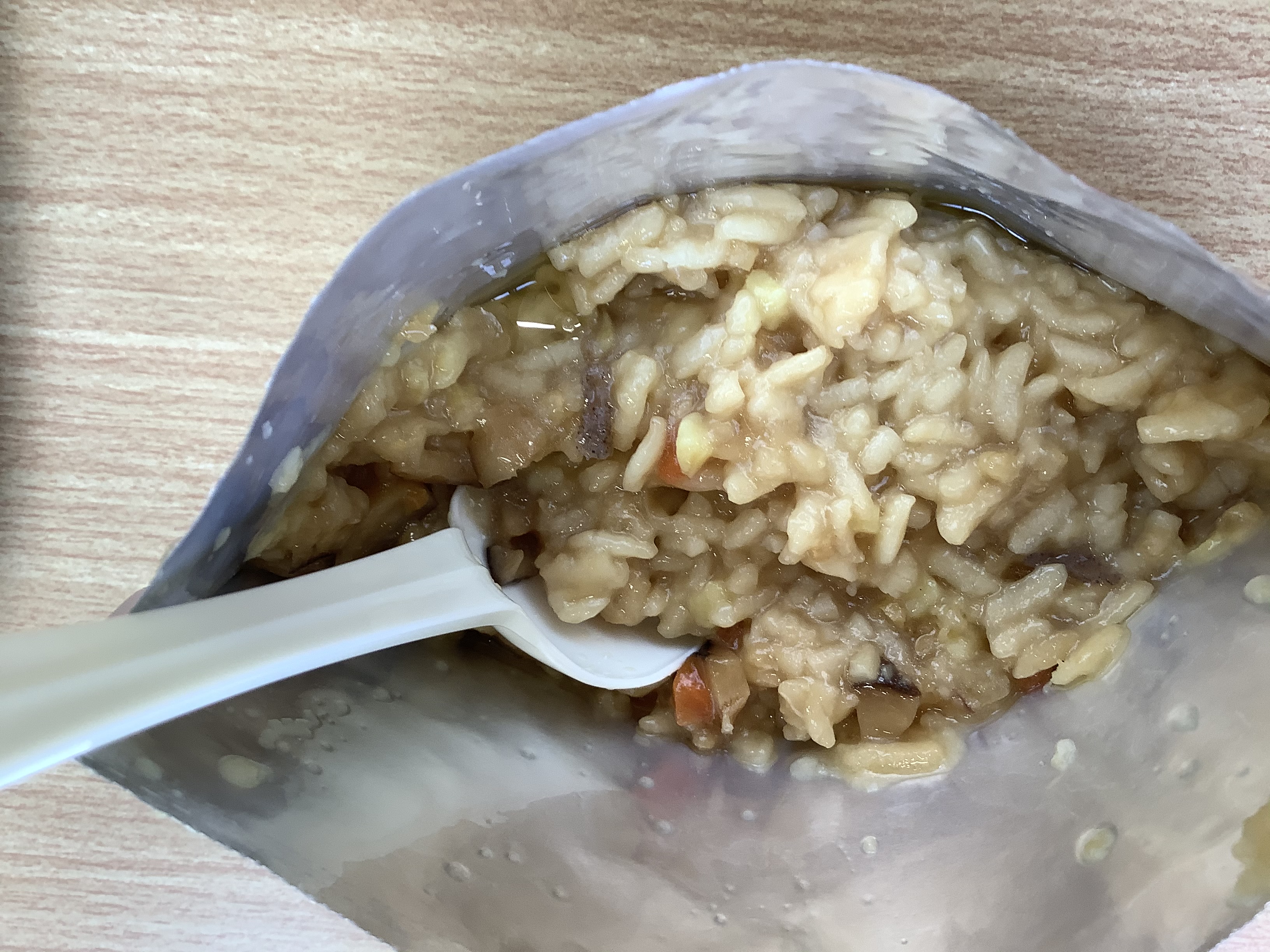 救給五目ごはんは、災害時に常温でそのままで食べられる非常食です。東日本大震災の後に、全国の栄養教諭・学校栄養職員の手により、開発されました。今回は、給食センターで湯煎して温めたものです。